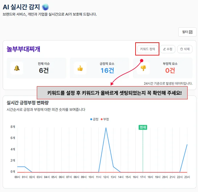 👉등록한 키워드가 올바르게 설정되었는지 반드시 확인해주세요. 잘못된 키워드 세팅은 분석 결과에 직접적인 영향을 줄 수 있습니다.