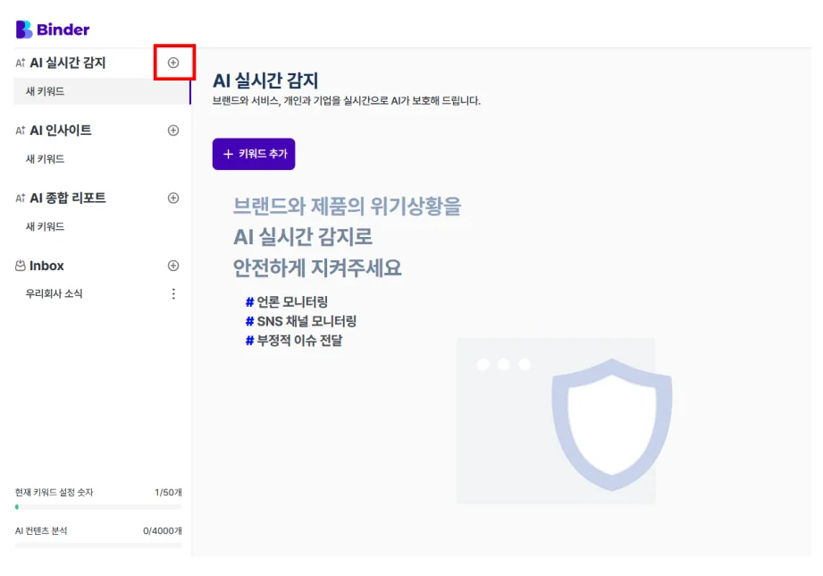 👉왼쪽 상단의 “플러스” 버튼을 클릭하면 원하는 키워드를 추가할 수 있습니다.