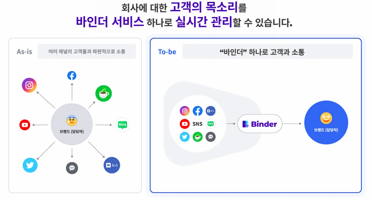 바인더는 산업과 규모를 막론하고 다양한 기업이 도입하여, VOC(고객 목소리) 관리와 고객 경험 혁신을 이루고 있습니다.