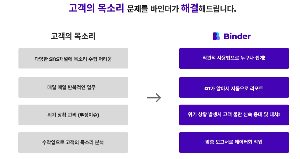 저희가 준비하는 바인더(Binder) 는 CX 담당자가 매일 고생하는 온라인 모니터링을 자동화하는 SaaS입니다.