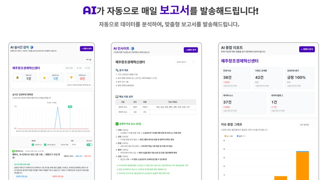자동 인사이트 제공: AI 기반으로 감성 분석과 트렌드 파악을 지원 → 마케터는 복잡한 리포트 작성 대신 전략 수립에 집중할 수 있습니다.