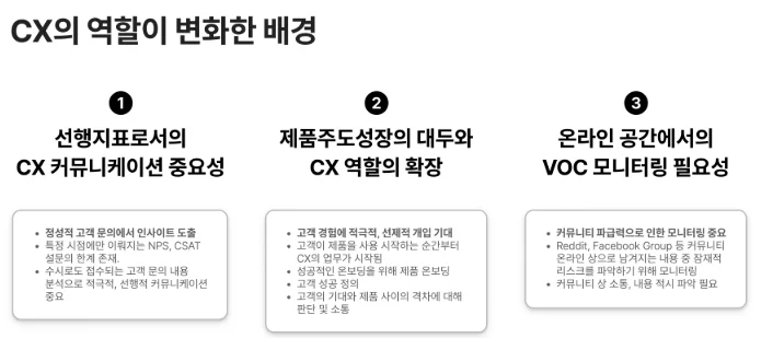 CX는 곧 매출과 직결됩니다. 긍정적인 경험은 추천(Referral)을 낳고, 부정적인 경험은 빠른 이탈로 이어집니다. CX를 개선하는 것은 곧 고객 생애 가치(LTV)를 높이는 전략입니다.CX 역할과 목표가 변화하였습니다.