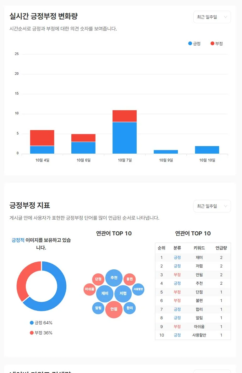 바인더를 통해 관련 게시글의 확산 속도와 감정 비율을 실시간으로 파악했습니다.