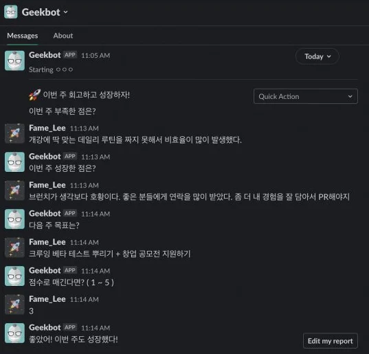 3๏ธโฃ ๊ธฑ๋ด(Geekbot) - ์ผ์ผ ๋ณด๊ณ & ์ ๋ฌด ์งํ ์ฒดํฌ ์๋ํ