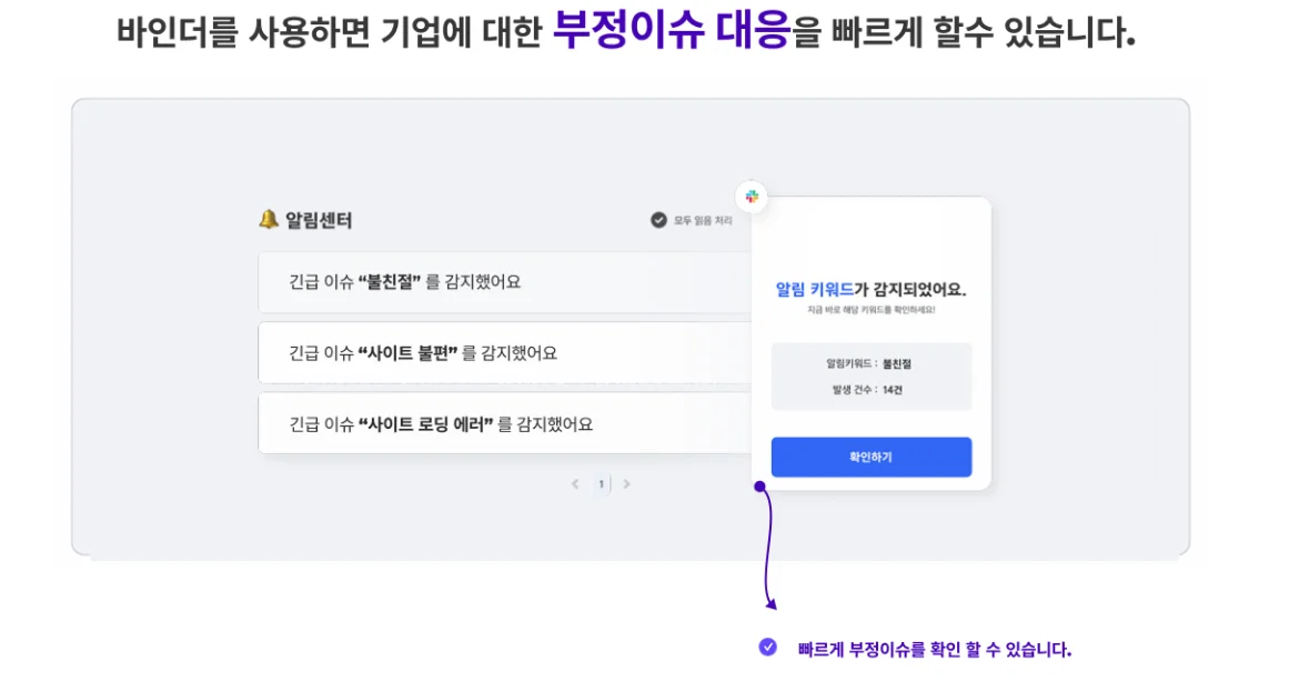 바인더는 고객불만을 실시간으로 전달해드립니다.